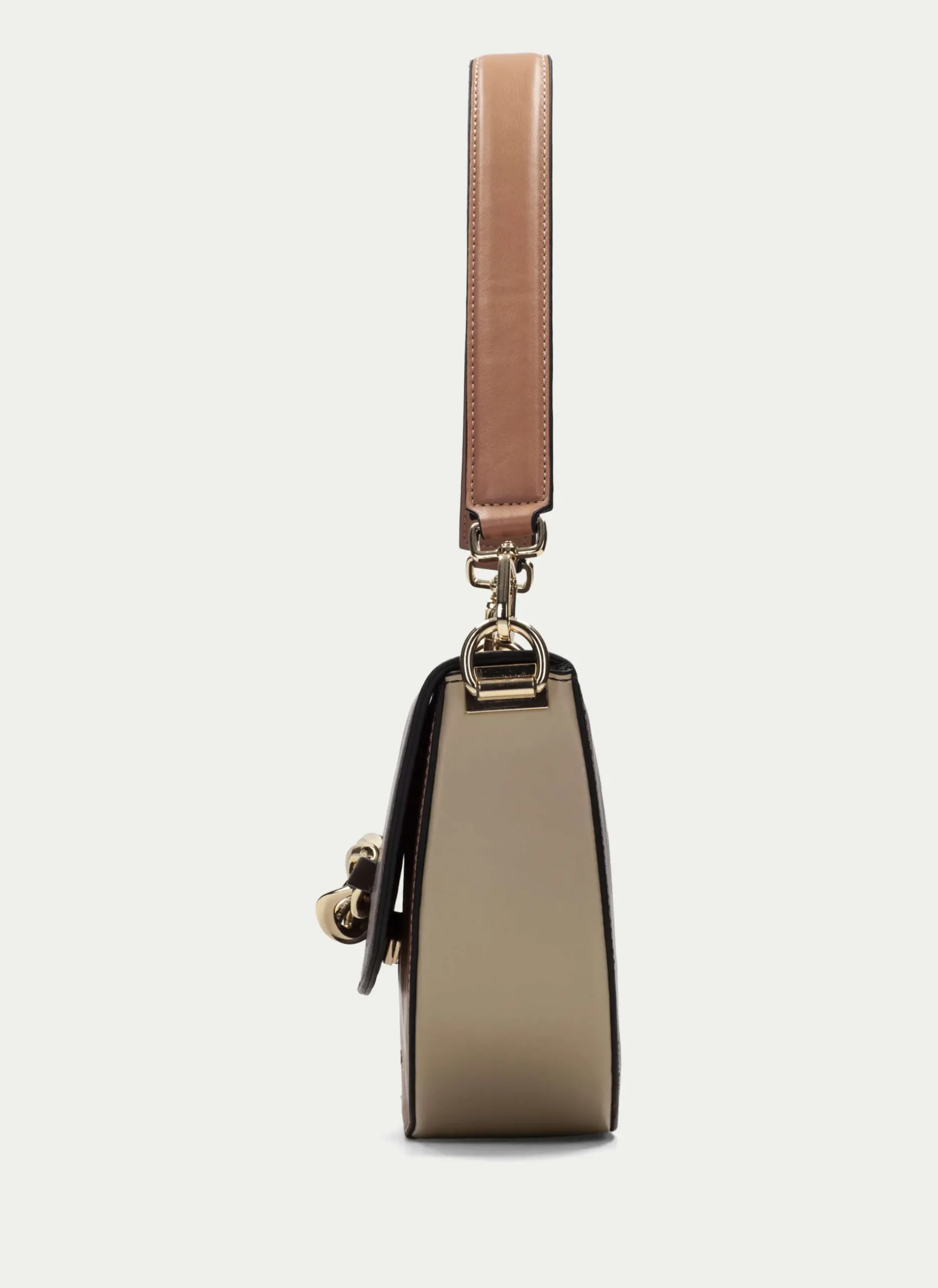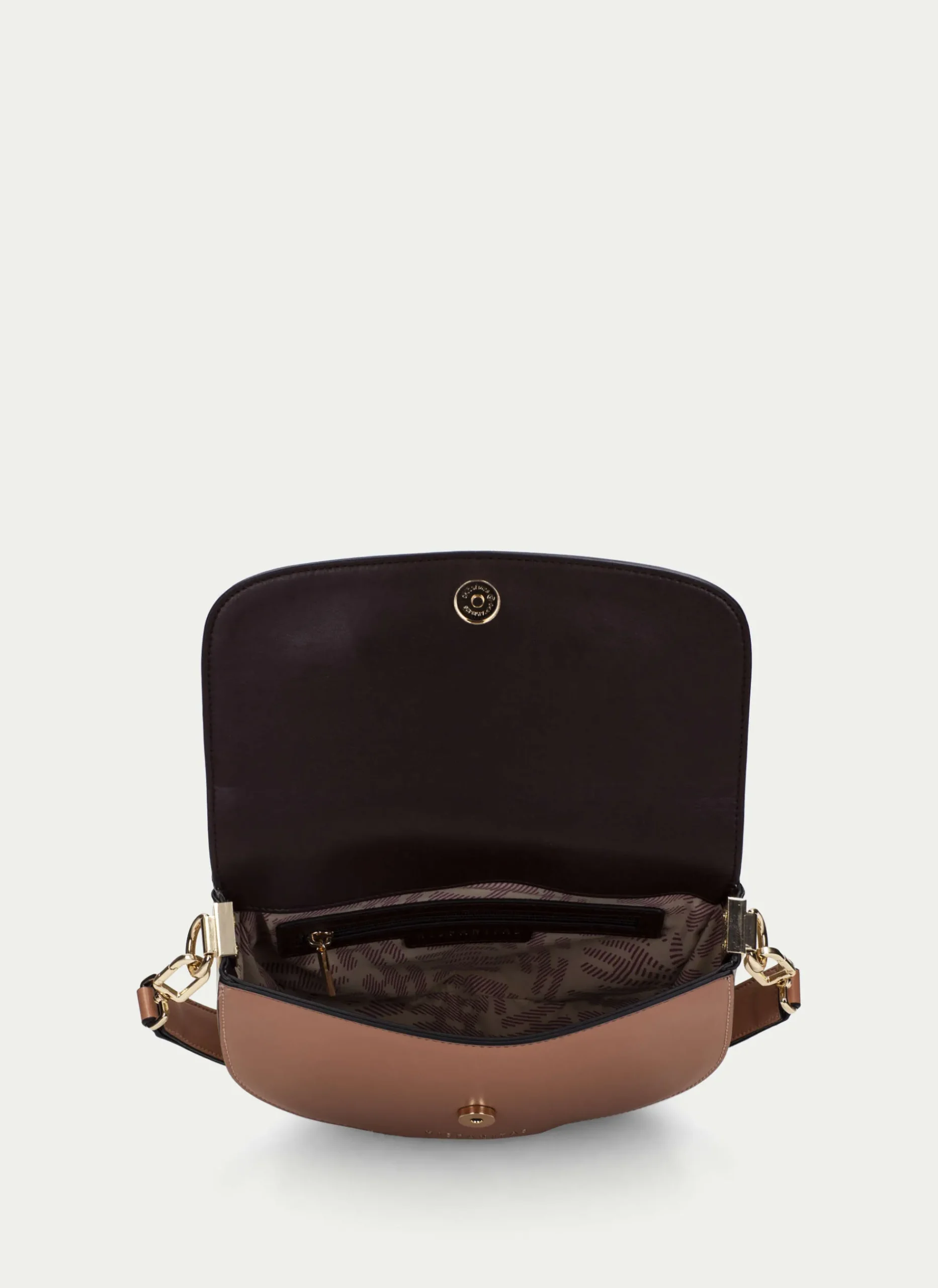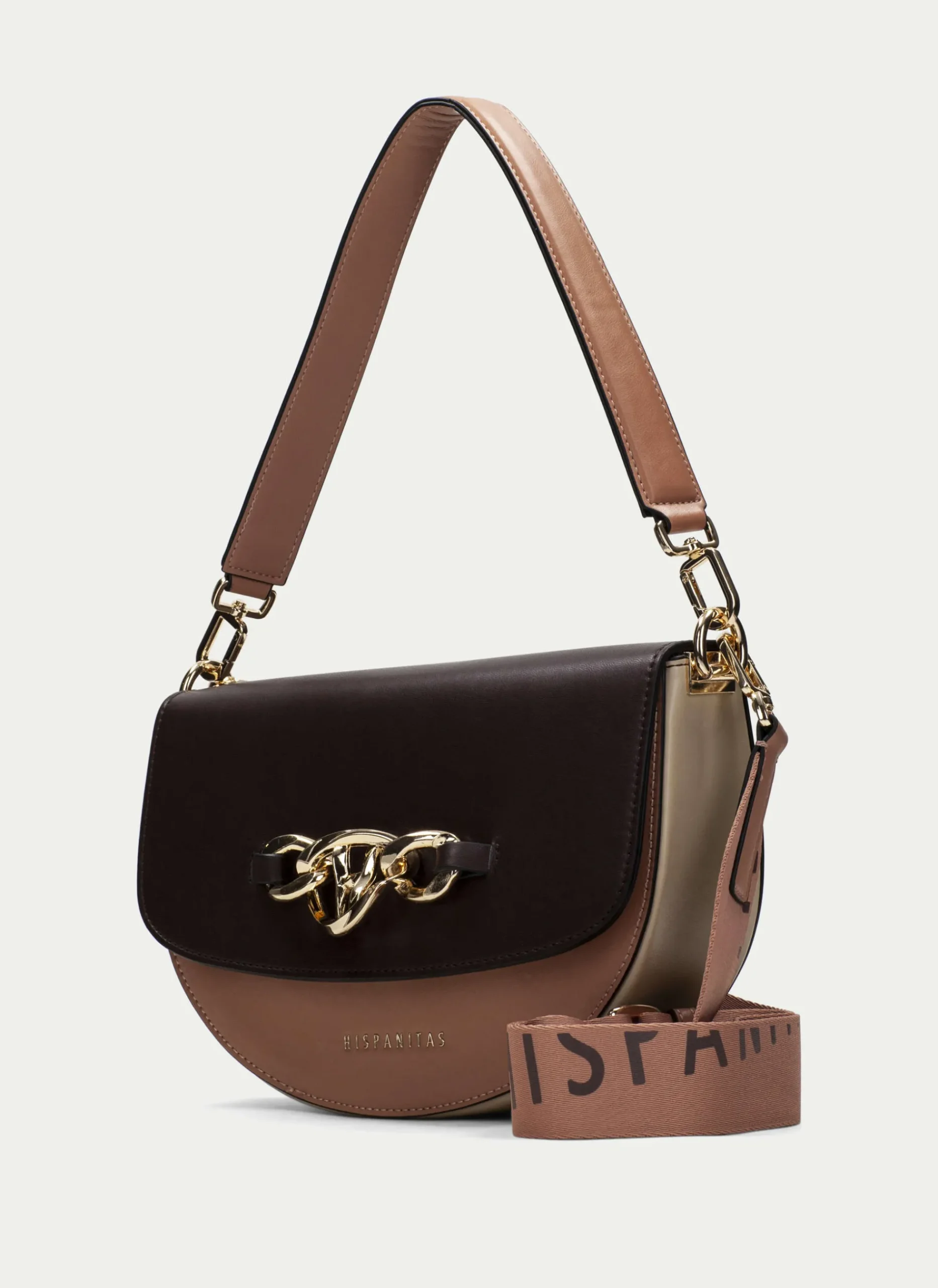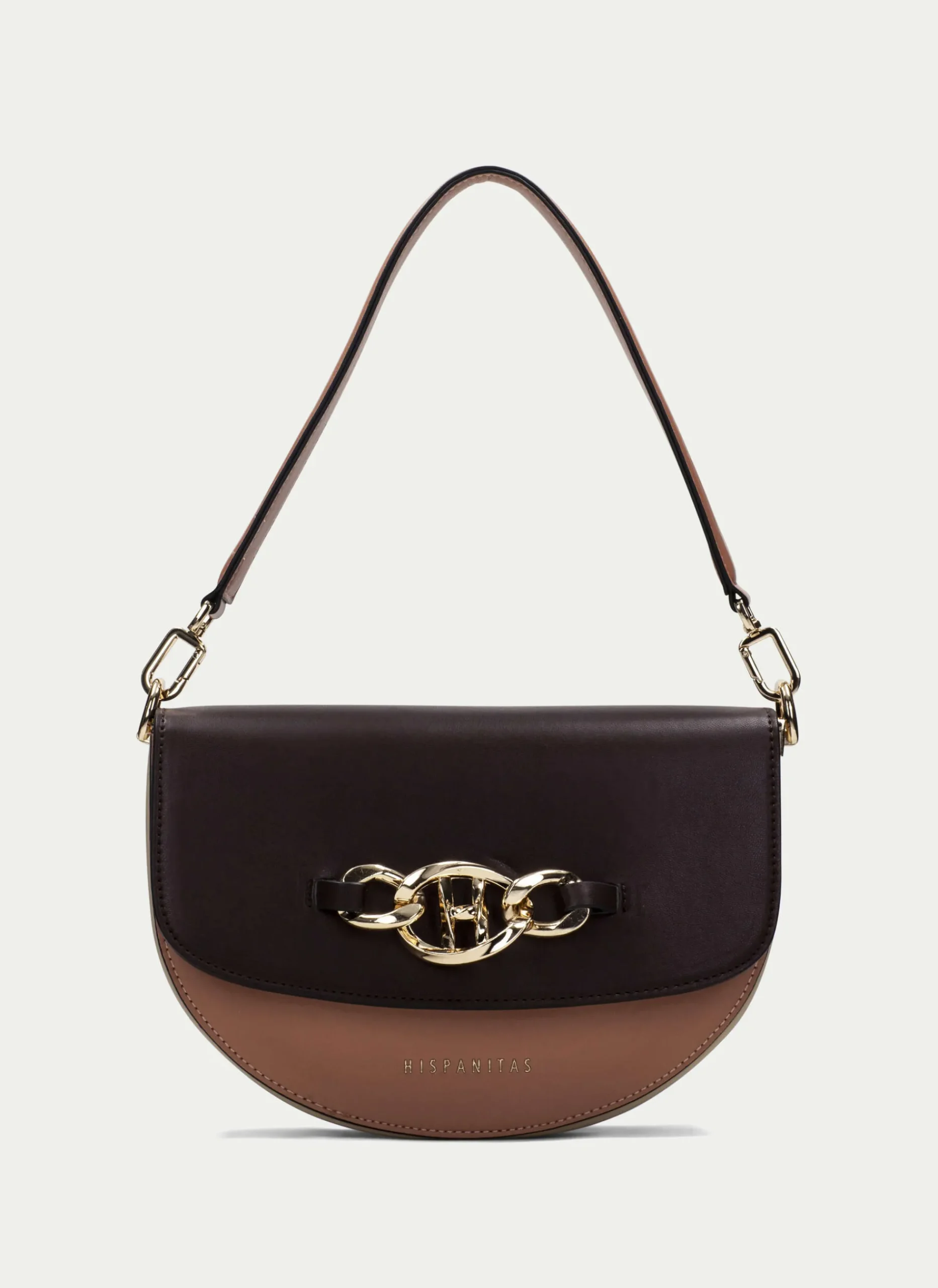 Bolso Mediano Rígido De Estilo Media Luna En Tonos Marrones. Detalle De Adorno Metalizado Y Nombre De La Marca En La Parte Frontal Y Cierre De Imán. Asa Larga Modulable Con Altura Máxima De 72Cm Desde El Hombre Y Detalle De Logotipo Cruzado, También Puedes Llevarlo En El Hombro Gracias A Su Segunda Asa Más Corta.